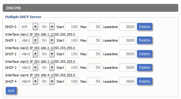 And a final time, click Add. Set DHCP 4 to vlan4 with a Leasetime of 1440 (24 hours).